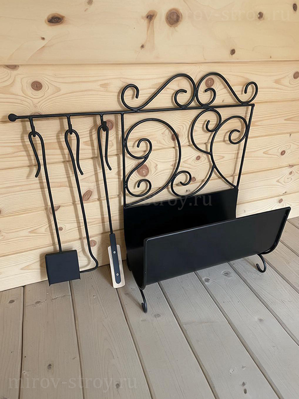 Благодаря наличию специальных крючков на самой дровнице совок, кочерга и щетка всегда на своем месте.