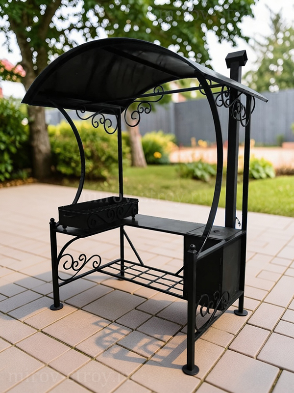Мангальный комплекс с печкой, оснащенный чугунной плитой с кольцами под казан.