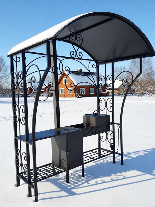 Мангальная зона оборудована печкой с чугунной плитой под казан, жаровней, коптилкой, столешницей и полками для дров.