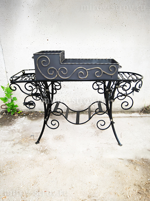 Мангал на кованом подстолье с полками и нишей для дров или угля