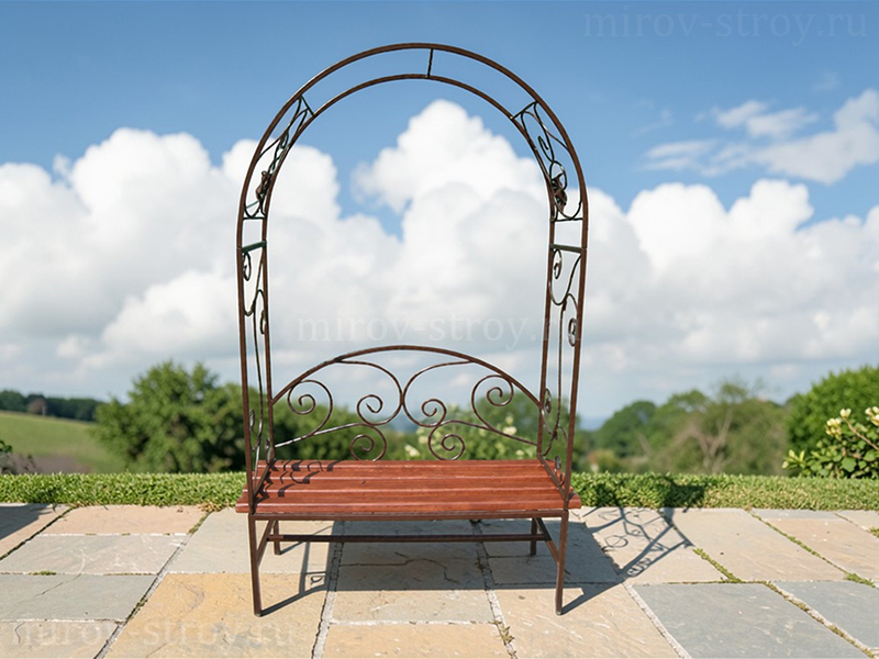 Скамейка с аркой может служить уютным местом для отдыха, окруженным цветами и вьющимися растениями.